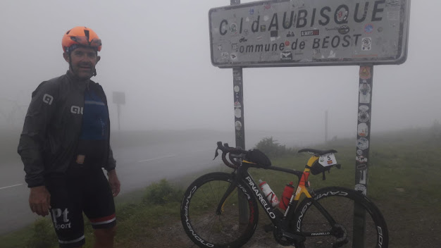 Mi amigo Héctor ya me había dicho que por esa vertiente el Col d’Aubisque era un “mero trámite”. Y efectivamente así lo parecía: los dos o tres primeros kilómetros la pendiente oscila entre el 3 y el 5 por 100 (nada que parezca difícil), pero a partir de ahí los kilómetros están siempre, de media, por encima del 7 por 100. ¿Y qué significa eso? Pues que sí ves que en el Garmin la pendiente marca el 4 por 100… ya te puedes atar los machos porque te vas a encontrar con un rampón al 14 por 100. Y cuando llevas 630 kilómetros en las patas eso hace mucho daño, pero que mucho daño. Pero si hemos llegado hasta aquí, las propias endorfinas dan la energía suficiente para superar esos rampones y coronar el puerto. Al llegar arriba la niebla nos envuelve, uno de mis compañeros me indica dónde está el cartel del puerto porque no se ve. No veo ni siquiera las bicicletas gigantes que sé que están en el alto del puerto.
